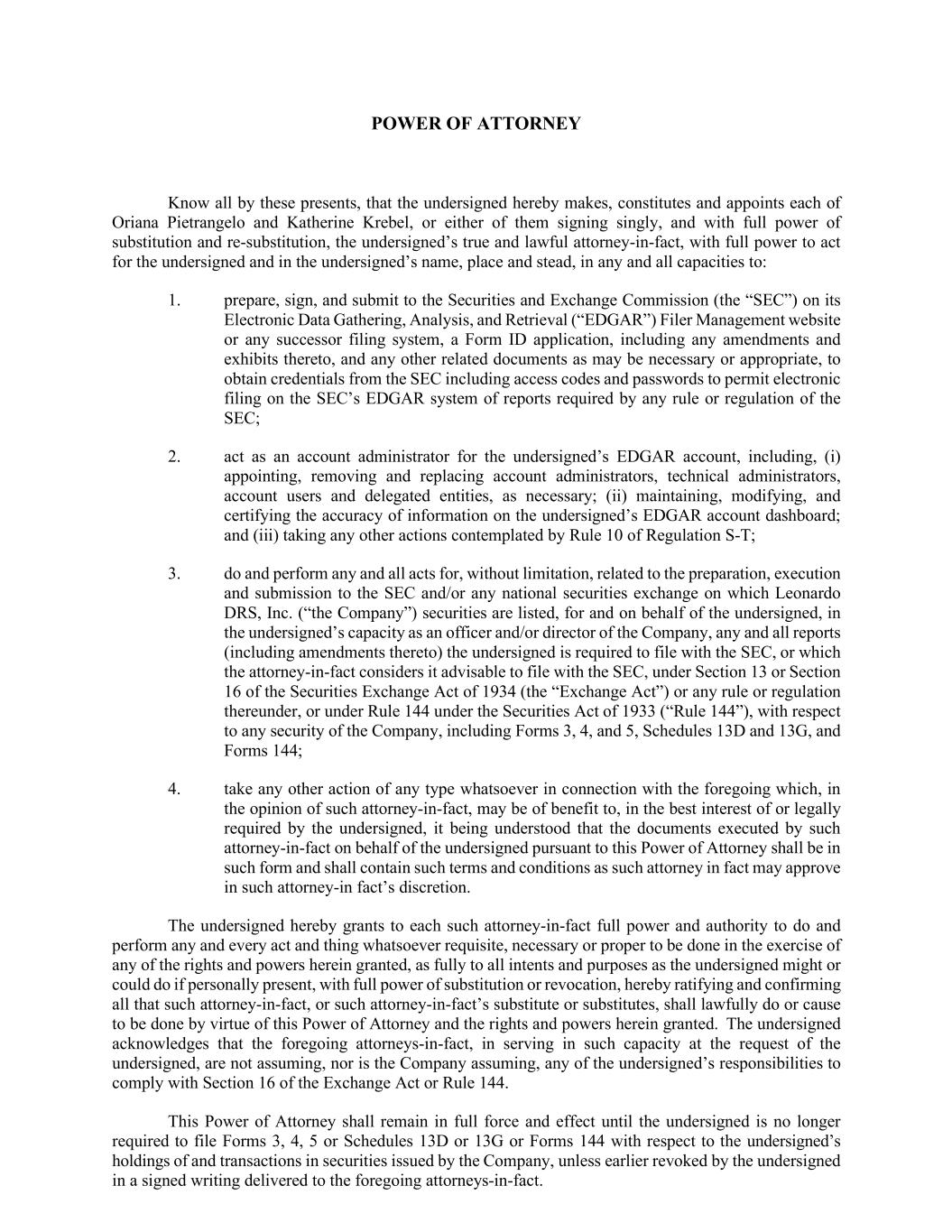 POWER OF ATTORNEY Know all by these presents, that the undersigned hereby makes, constitutes and appoints each of Oriana Pietrangelo and Katherine Krebel, or either of them signing singly, and with full power of substitution and re-substitution, the undersigned’s true and lawful attorney-in-fact, with full power to act for the undersigned and in the undersigned’s name, place and stead, in any and all capacities to: 1. prepare, sign, and submit to the Securities and Exchange Commission (the “SEC”) on its Electronic Data Gathering, Analysis, and Retrieval (“EDGAR”) Filer Management website or any successor filing system, a Form ID application, including any amendments and exhibits thereto, and any other related documents as may be necessary or appropriate, to obtain credentials from the SEC including access codes and passwords to permit electronic filing on the SEC’s EDGAR system of reports required by any rule or regulation of the SEC; 2. act as an account administrator for the undersigned’s EDGAR account, including, (i) appointing, removing and replacing account administrators, technical administrators, account users and delegated entities, as necessary; (ii) maintaining, modifying, and certifying the accuracy of information on the undersigned’s EDGAR account dashboard; and (iii) taking any other actions contemplated by Rule 10 of Regulation S-T; 3. do and perform any and all acts for, without limitation, related to the preparation, execution and submission to the SEC and/or any national securities exchange on which Leonardo DRS, Inc. (“the Company”) securities are listed, for and on behalf of the undersigned, in the undersigned’s capacity as an officer and/or director of the Company, any and all reports (including amendments thereto) the undersigned is required to file with the SEC, or which the attorney-in-fact considers it advisable to file with the SEC, under Section 13 or Section 16 of the Securities Exchange Act of 1934 (the “Exchange Act”) or any rule or regulation thereunder, or under Rule 144 under the Securities Act of 1933 (“Rule 144”), with respect to any security of the Company, including Forms 3, 4, and 5, Schedules 13D and 13G, and Forms 144; 4. take any other action of any type whatsoever in connection with the foregoing which, in the opinion of such attorney-in-fact, may be of benefit to, in the best interest of or legally required by the undersigned, it being understood that the documents executed by such attorney-in-fact on behalf of the undersigned pursuant to this Power of Attorney shall be in such form and shall contain such terms and conditions as such attorney in fact may approve in such attorney-in fact’s discretion. The undersigned hereby grants to each such attorney-in-fact full power and authority to do and perform any and every act and thing whatsoever requisite, necessary or proper to be done in the exercise of any of the rights and powers herein granted, as fully to all intents and purposes as the undersigned might or could do if personally present, with full power of substitution or revocation, hereby ratifying and confirming all that such attorney-in-fact, or such attorney-in-fact’s substitute or substitutes, shall lawfully do or cause to be done by virtue of this Power of Attorney and the rights and powers herein granted. The undersigned acknowledges that the foregoing attorneys-in-fact, in serving in such capacity at the request of the undersigned, are not assuming, nor is the Company assuming, any of the undersigned’s responsibilities to comply with Section 16 of the Exchange Act or Rule 144. This Power of Attorney shall remain in full force and effect until the undersigned is no longer required to file Forms 3, 4, 5 or Schedules 13D or 13G or Forms 144 with respect to the undersigned’s holdings of and transactions in securities issued by the Company, unless earlier revoked by the undersigned in a signed writing delivered to the foregoing attorneys-in-fact.